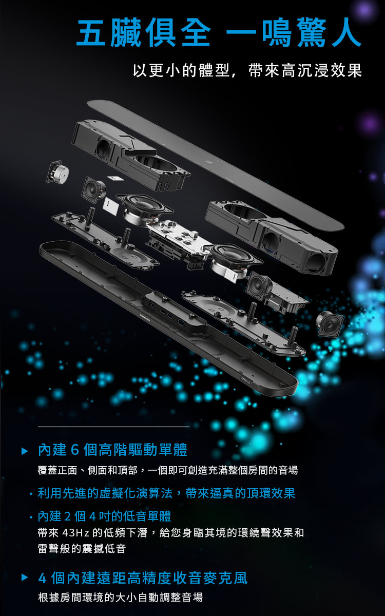 強勁的低音:雙低音炮和發燒級驅動器可提供深沉、水晶般清晰的聲音和令人印象深刻的保真度,為您的電影、音樂和遊戲增添豐富感和衝擊力